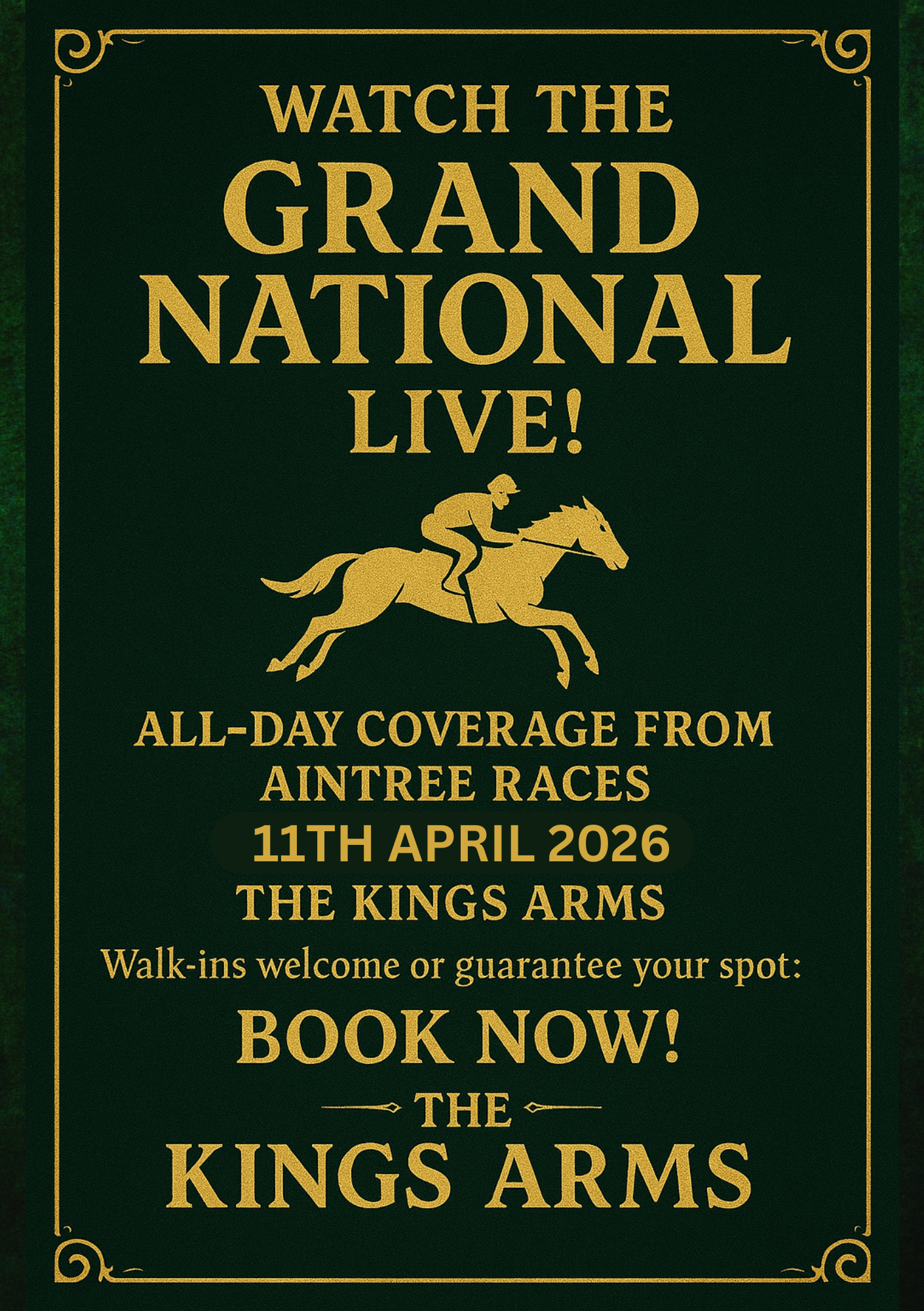 Watch all the Aintree Races, including the Grand National LIVE at the Kings Arms, join us for a fantastic atmosphere and a lovely pint!